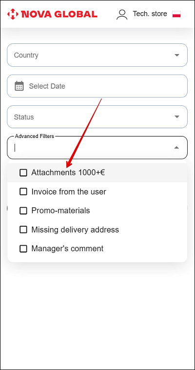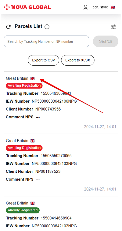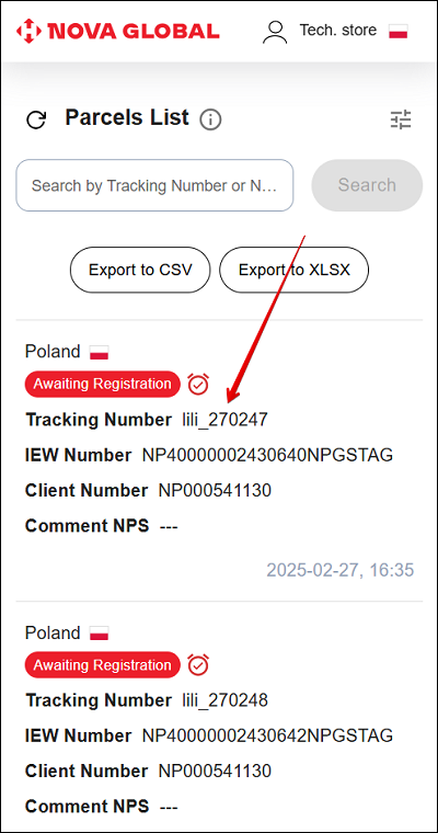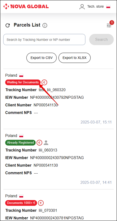 On the List of Parcels for Poland page, searching by tracking number or NP number, as well as using filters, works the same way as for parcels from any other country. However, the Attachments 1000+€ filter is available exclusively when searching for parcels from Poland.