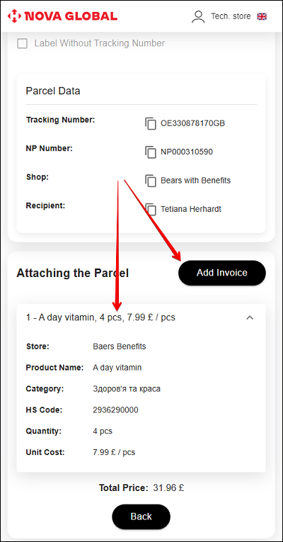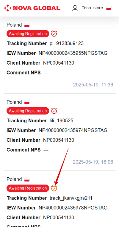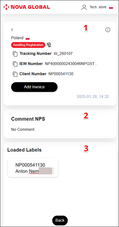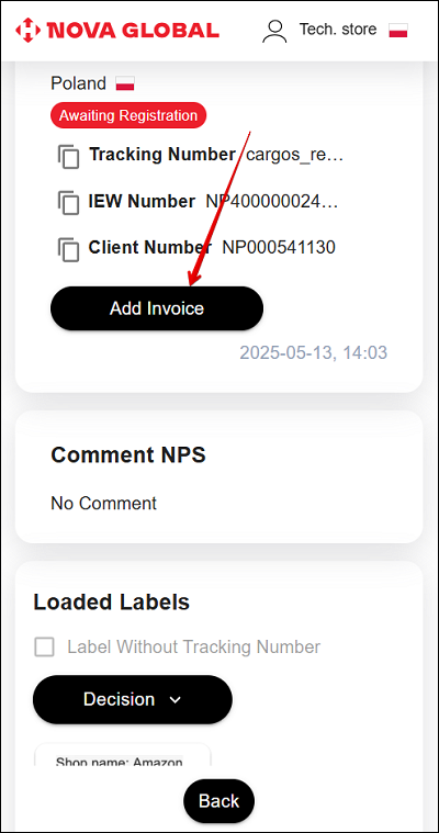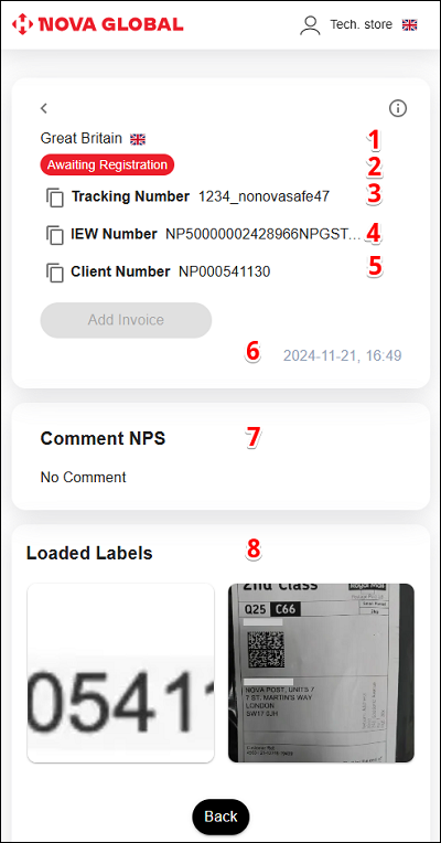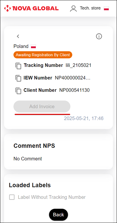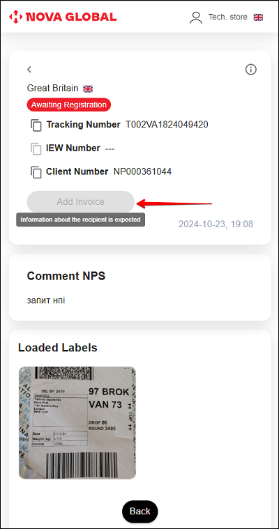 If the parcel has been assigned the Awaiting Registration status, it means that the parcel, along with the data from the label, has been successfully saved in the NPS system and is awaiting registration by the customer—provided that 24 hours have not passed since it was added as unregistered (a timer will be displayed in the Parcel Card). If this time period has expired, the Add Invoice button becomes available to the Tech.store employee.