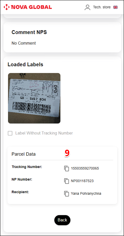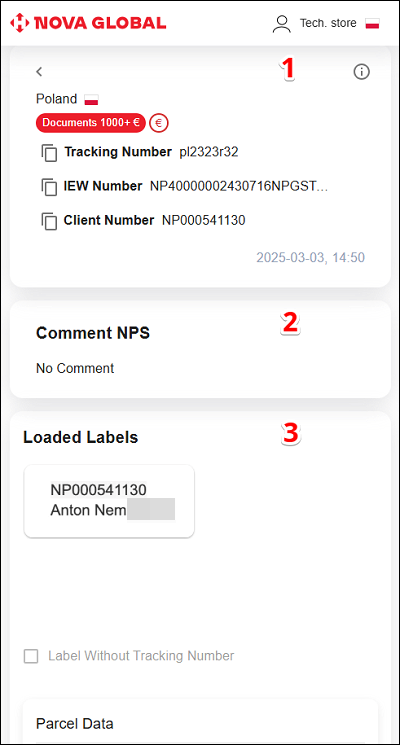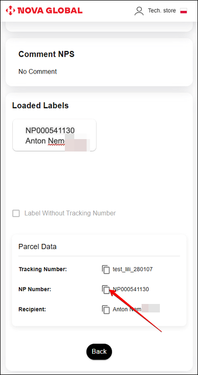 | 3 | Loaded Labels | Allows you to view the parcel's NP number, sender's details, and copy the following parcel data: