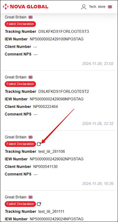 If the parcel was not successfully registered, it is assigned the Failed Declaration status. The Tech.store employee has the option to re-add the invoice up to two times if the first attempt was unsuccessful. On the Parcel Card page, the option to re-add the invoice is represented by a corresponding icon. Hovering over the icon displays the number of remaining attempts.