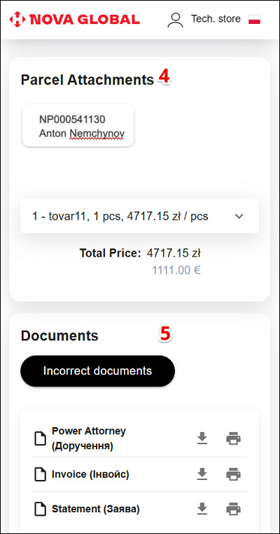 | 4 | Parcel Attachments | Allows you to view the NP number of the parcel, sender's data, and the following information about the shipment. |