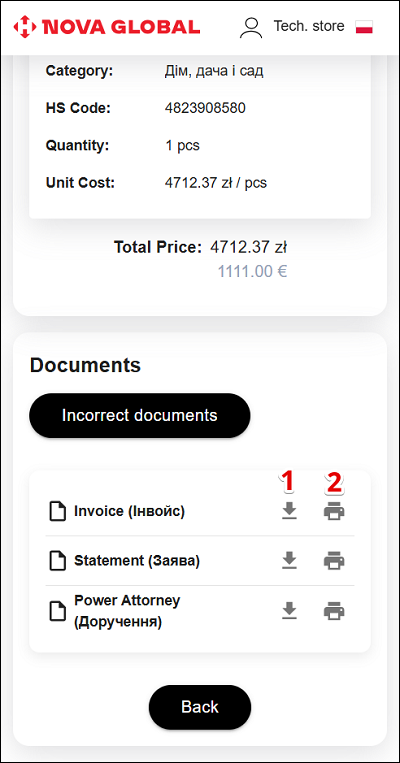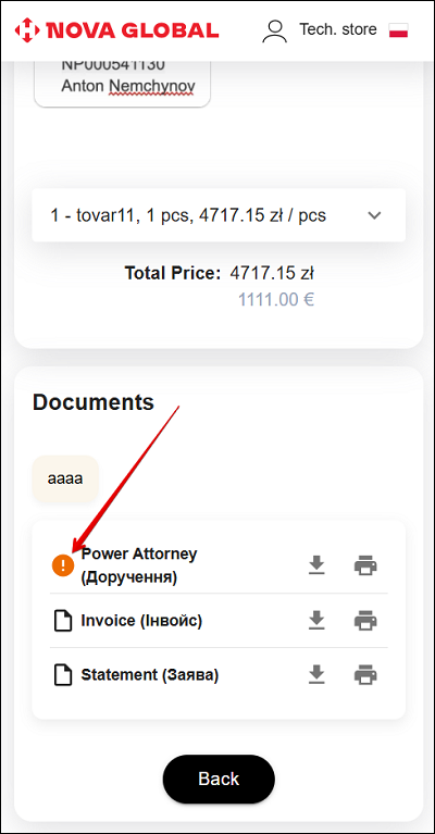 If a parcel is in the Waiting for Documents status, this indicates that its value exceeds €1,000. In such cases, the Tech.store employee must wait for the user to upload documents confirming the parcel's declared value. Once the recipient submits the necessary documents, NPS forwards them to Tech.store. The parcel is then assigned the Documents 1000+€ status, and the Tech.store employee must forward the documents to the person responsible for processing.