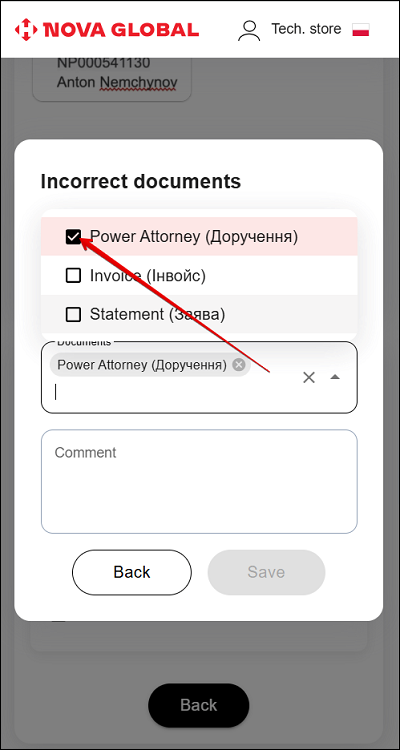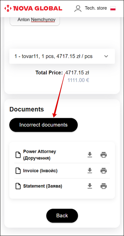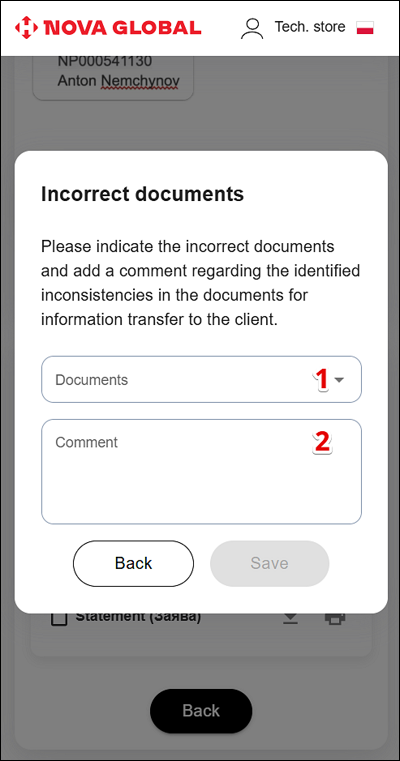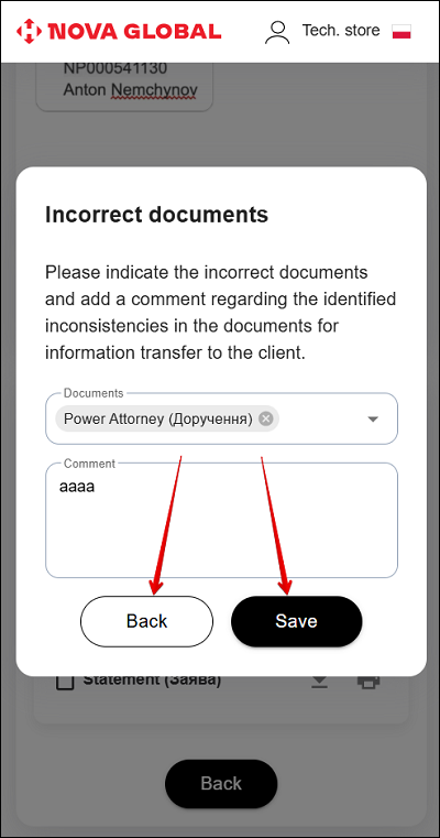 If incorrect documents were found, the Tech.store employee should mark such documents and add a comment. To perform these actions, click the Incorrect documents button.