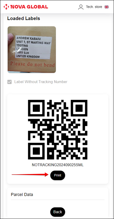 Parcels without track number (parcel with TN Generated, Awaiting Registration the status), include the display of QR and TN, it can be printed by clicking the Print button in the parcel card.