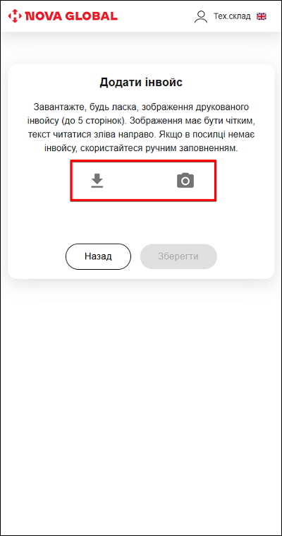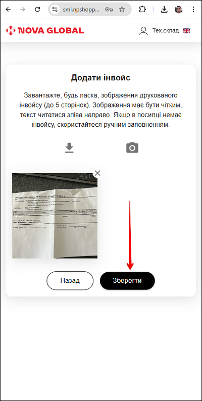 Увага! На мобільній версії доступне як завантаження зображень, так і можливість відкрити камеру, щоб одразу зробити фото інвойсу