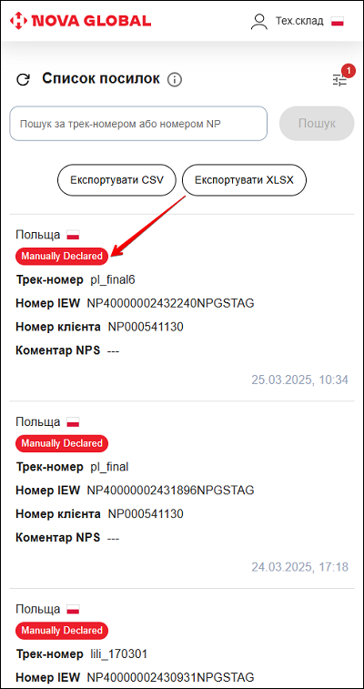 Зона ручного декларування повинна перескановуватись 2 рази на день - вранці і ввечері. Співробітник Тех.складу перевіряє статус посилки:
