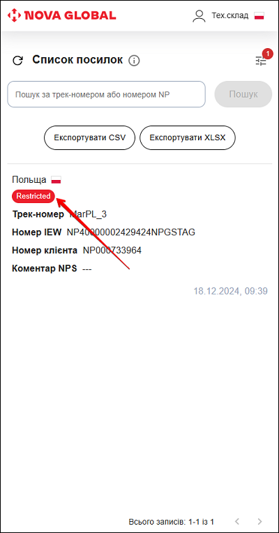 Якщо в посилці є заборонений вантаж, вона отримує статус Restricted. Подальші дії неможливі.