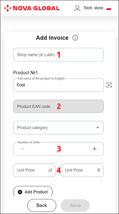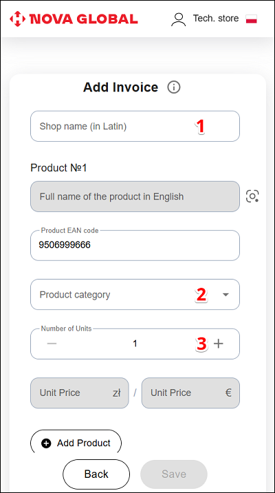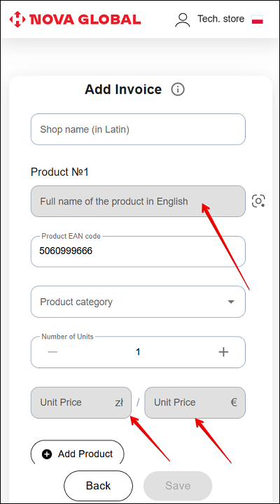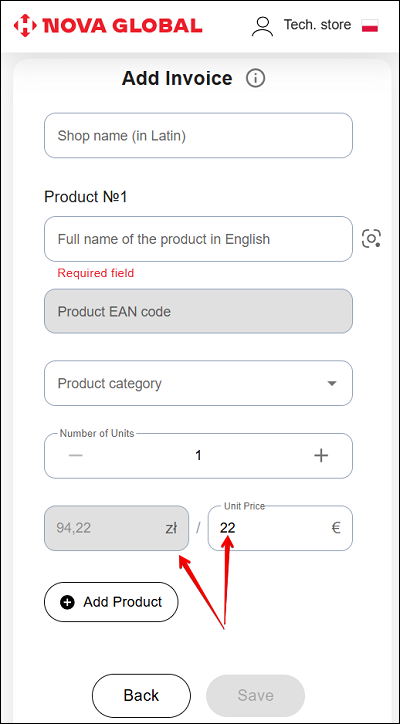 | 4 | Price per Unit | Enter the unit price in Zł / Enter the unit price in € |