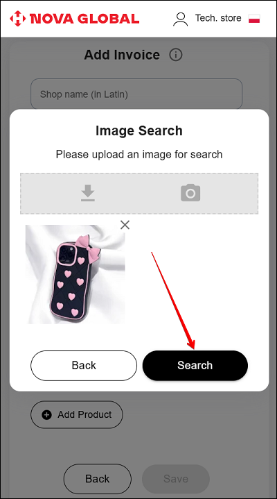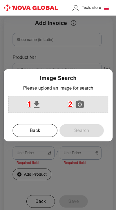 To simplify the description of a product, use the feature of product search by photo via Google Lens. Click the Camera icon next to the Full Product Name in English field and upload a photo for search.