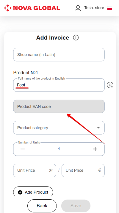 When entering a valid EAN code, the Full Product Name in English and Unit Cost fields become unavailable for data entry. The data will be retrieved from the available product databases.